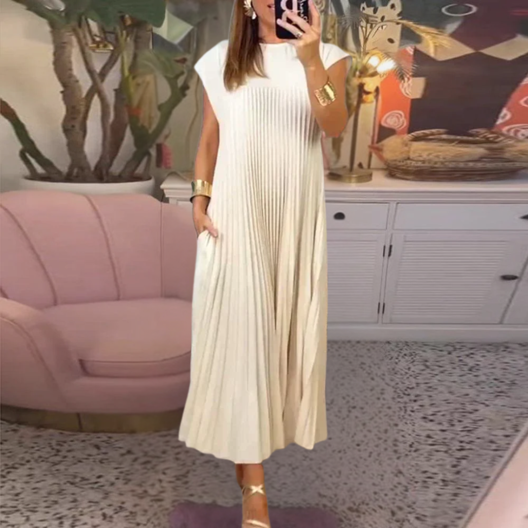 Het geplooide ontwerp van Eloria beweegt sierlijk met je lichaam mee en creëert een flatterend silhouet dat past als een droom. De mouwloze snit en het lichte materiaal maken het ideaal voor laagjes of om solo te dragen in alle seizoenen. Zie er gepolijst uit en voel je overal op je gemak.