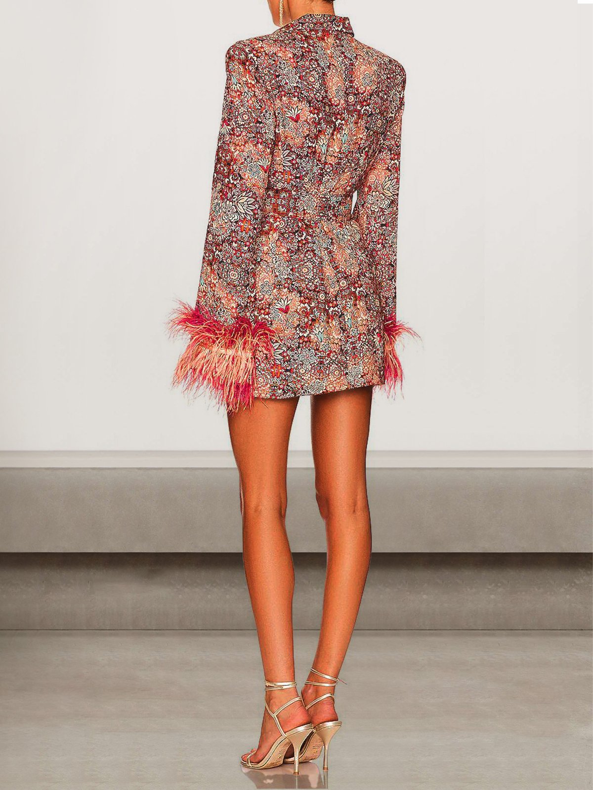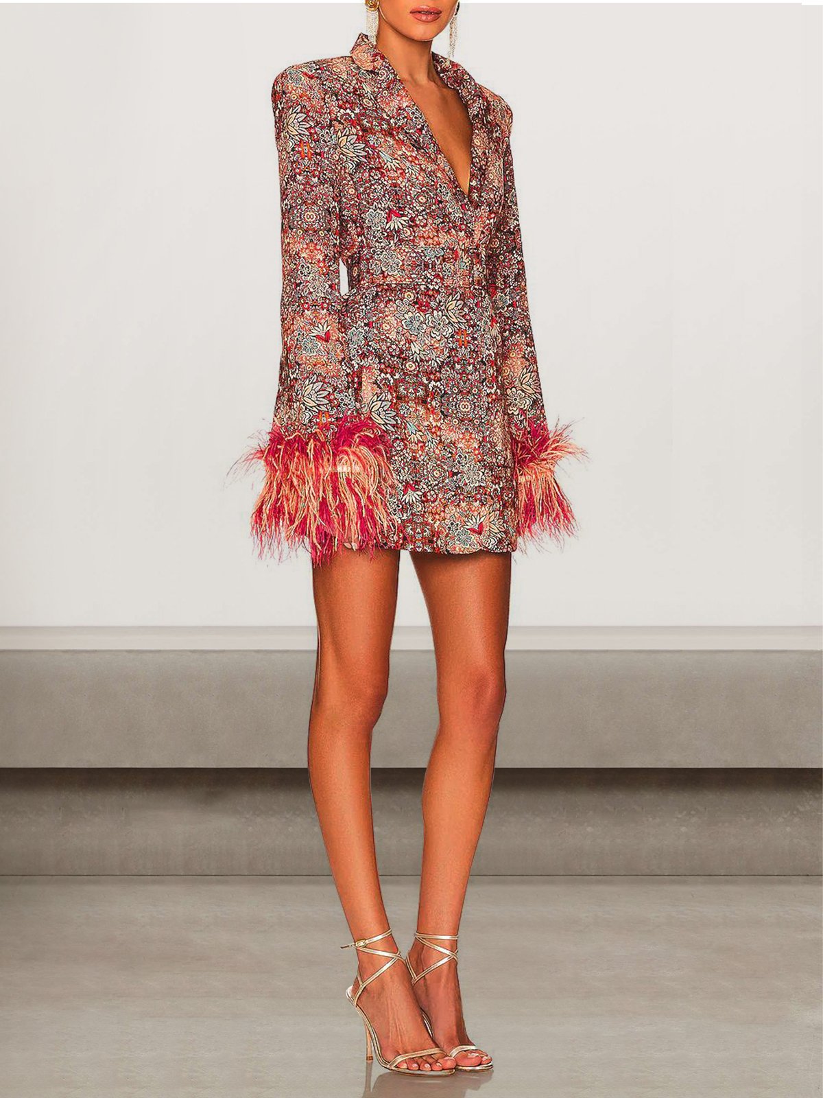 Feathéreau is niet de doorsnee blazerjurk - dit stuk is een combinatie van scherpe snit en zachte glamour. De gestructureerde revers, de ceintuur in de taille en het getailleerde silhouet benadrukken je rondingen, terwijl de gevederde manchetten een gedurfde, fashion-forward twist geven die de spotlight steelt.