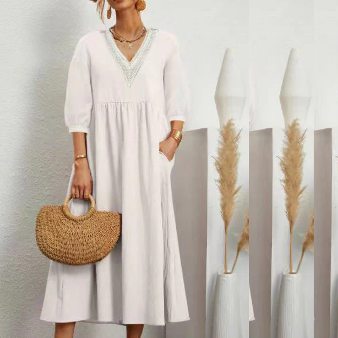 Kaila | Jurk van katoen en linnen met V-hals, losse mouwen en kant