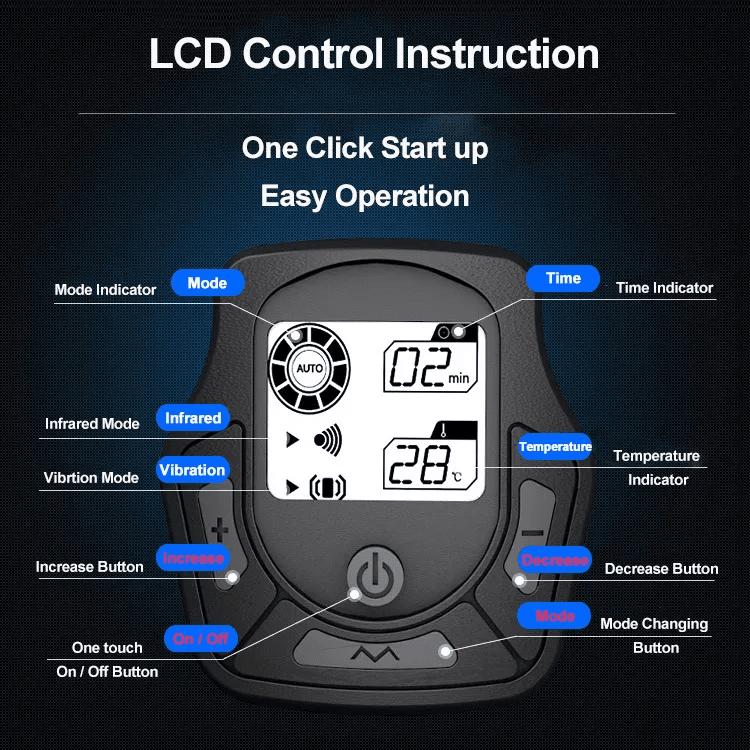 De KneeRelief is ontworpen voor gebruiksgemak, zodat u thuis kunt genieten van een professionele therapie. Met de gebruiksvriendelijke bediening kunt u de intensiteit van de warmte en trillingen aanpassen aan uw behoeften. Het is perfect voor dagelijks gebruik, zodat u actief kunt blijven, sneller kunt herstellen en zonder pijn kunt bewegen.