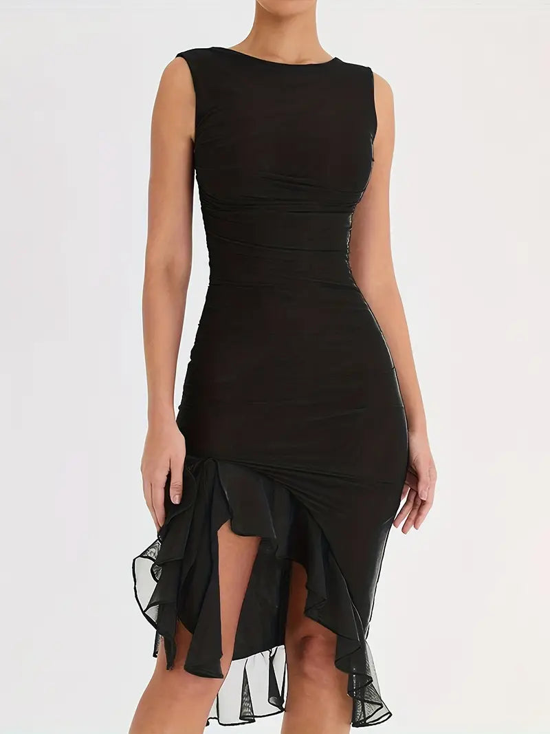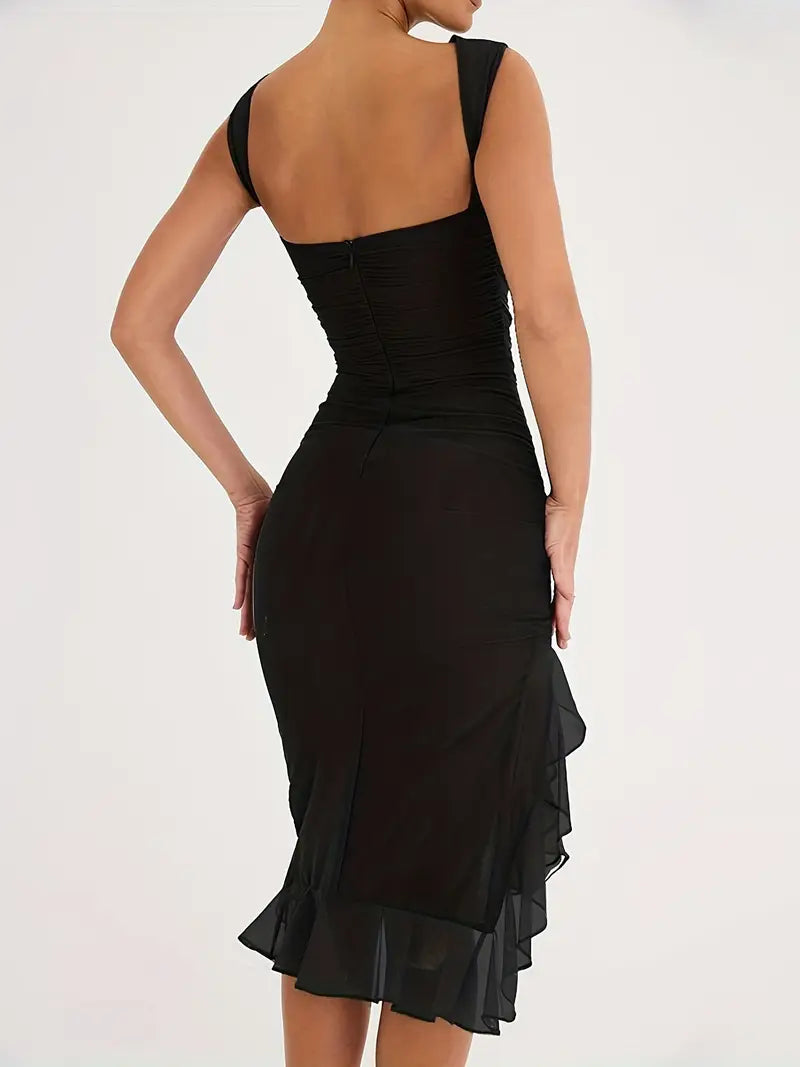 Met delicate plooien en een verfijnde mouwloze snit, brengt Sylvara je beste eigenschappen op de meest gracieuze manier naar voren. Het rugloze ontwerp voegt een vleugje durf toe met behoud van klassieke elegantie, waardoor het de perfecte jurk is voor vrouwen die zich gedurfd en mooi willen voelen.